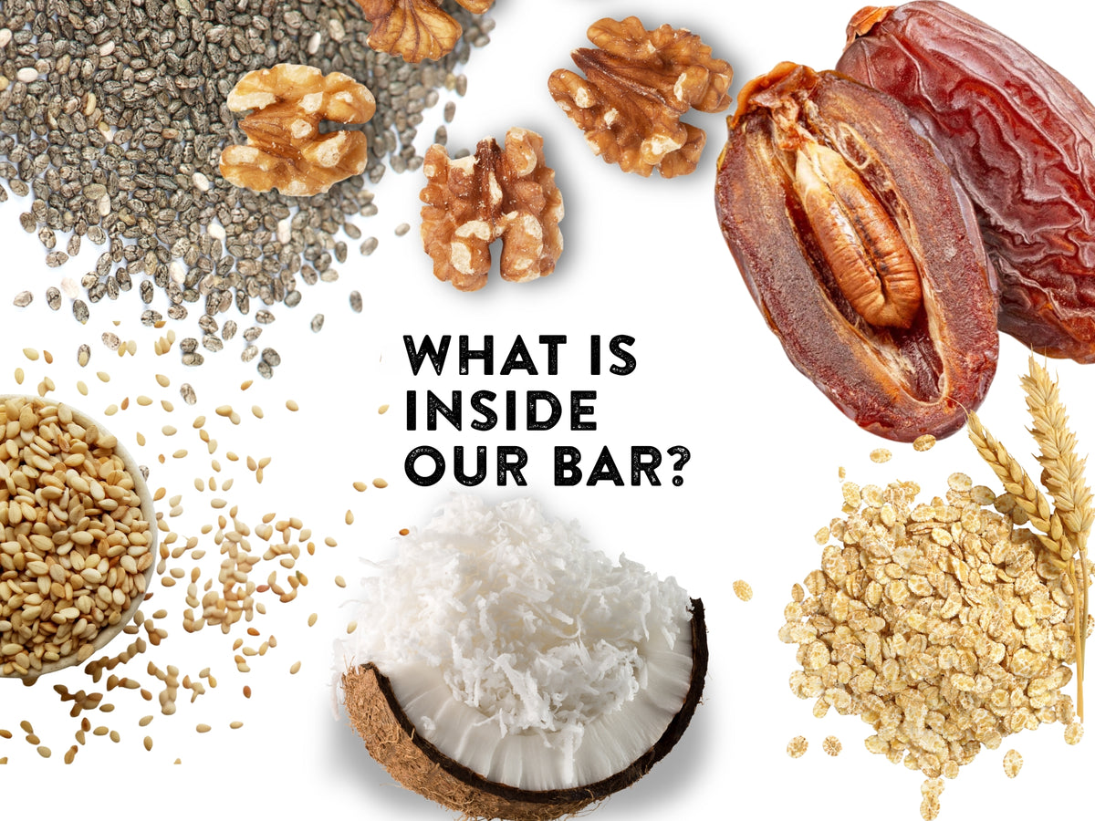 Dates, walnuts, sesame, organic chia, oats, unsweetened coconut flakes