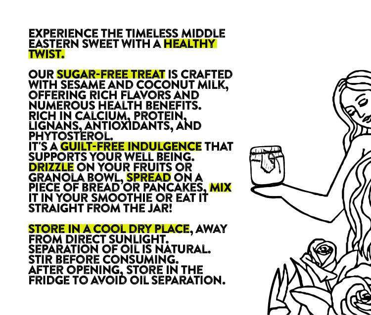 We believe in minimally processed, simple food, preserving the ingredients to their origins in nature. Made from a blend of sesame butter/tahini, chocolate, coconut, date syrup and monk fruit. A versatile treat perfect for any occasion. Our creamy halva spread offers a unique taste that enhances everything from toast, croissants, bagels, pastries to smoothies, and desserts and you can even bake with it. You're going to love it so much it's likely to be your new pantry essential for a delicious, nutritious addition to your meals.
