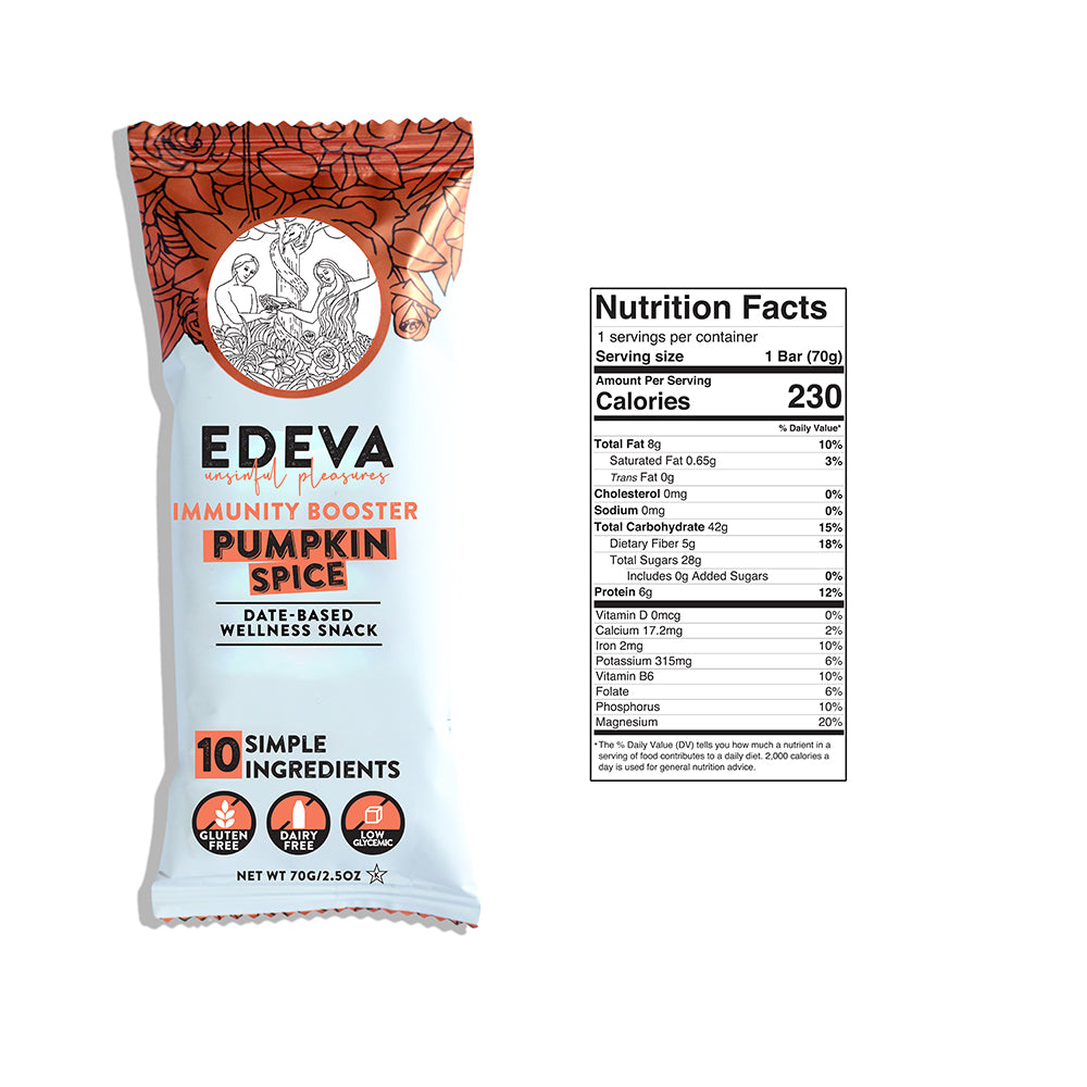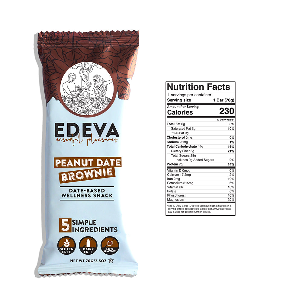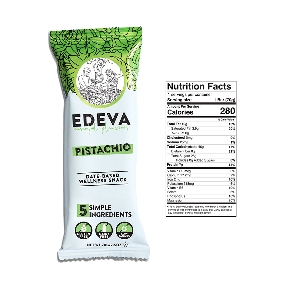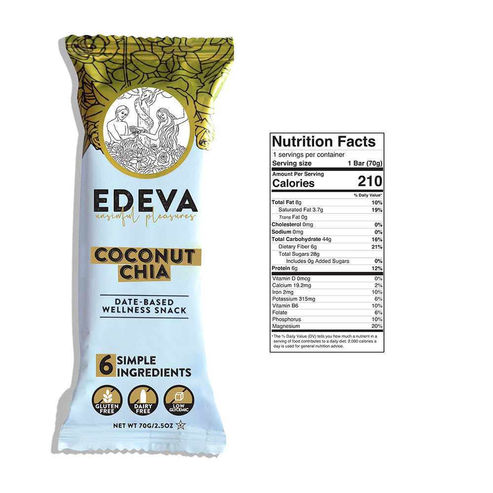 Experience the delightful, minimally processed, wholesome balance of ingredients from Edeva's natural Garden of Edeva. Edeva's wellness bars burst with freshness and are packed with health benefits from the superpower of dates. These nutrient-dense dates provide a joyful, sweet, and robust taste while promoting brain and bone health and offering a rich source of antioxidants.